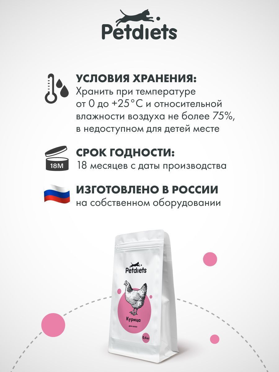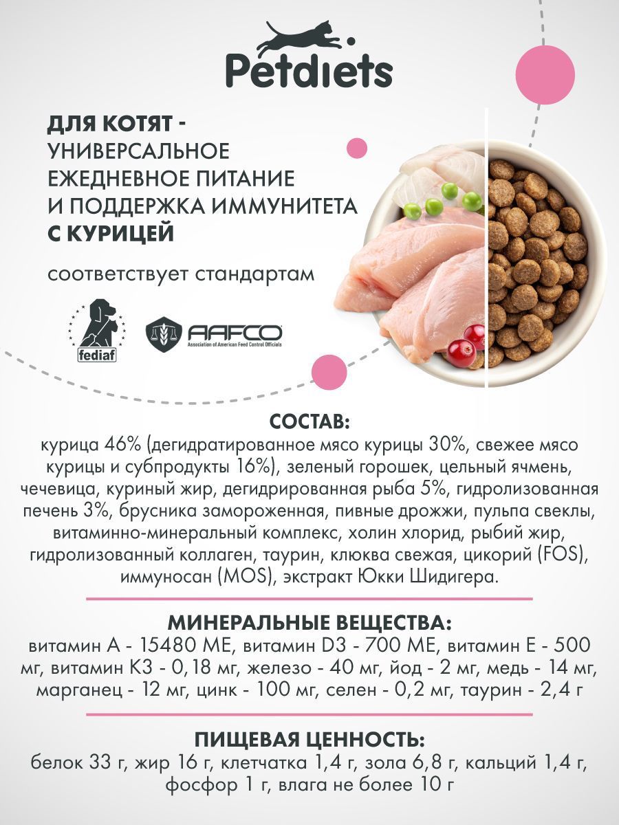 Корм Petdiets «Курица» для котят — это не просто еда. Это забота о будущем вашего питомца. Его здоровье, активность, крепкий иммунитет и полноценное развитие зависят от качественного, сбалансированного питания. С Petdiets вы можете быть уверены: каждый ингредиент в составе работает на благо растущего организма. Подарите котёнку крепкое здоровье с первых недель жизни — выбирайте Petdiets!