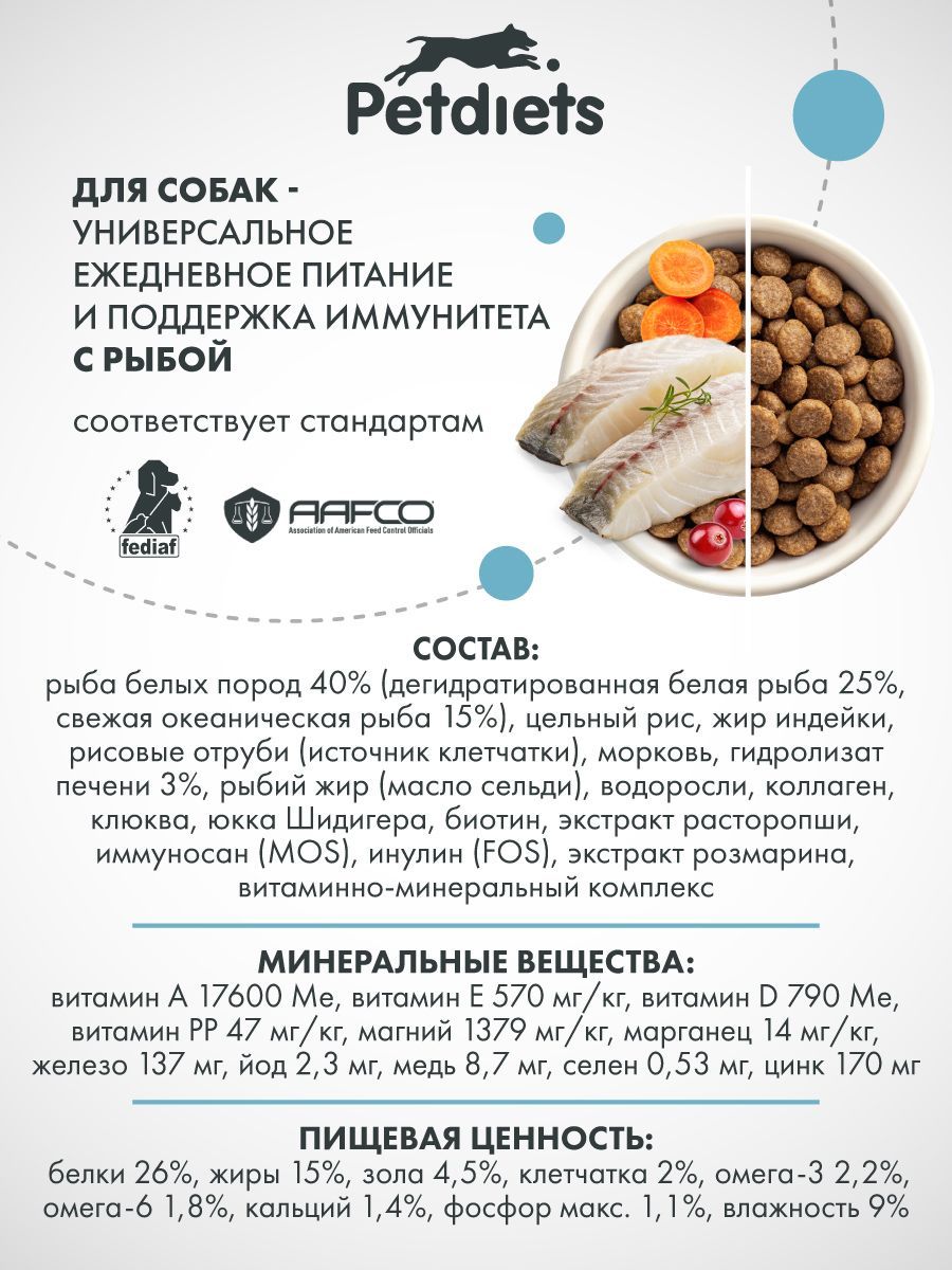 Сухие собачьи корма petdiets отличаются стабильностью качества независимо от партии выпуска, что гарантирует постоянство полезных свойств пищи для вашего друга с шерстью.