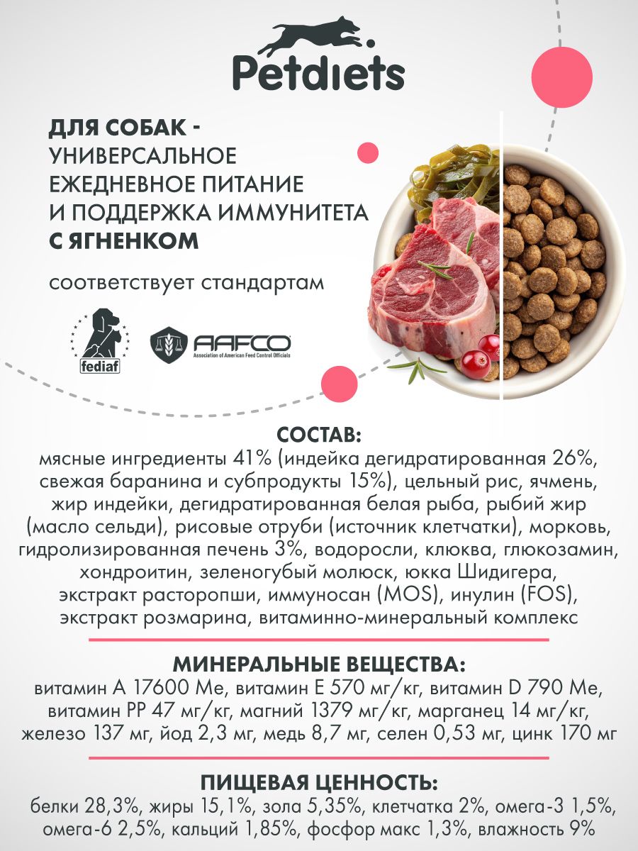 Корм Petdiets с ягнёнком - это не просто питание, а сбалансированная формула на основе баранины, рыбы, хондропротекторов и натуральных экстрактов, что делает его отличным выбором для владельцев, которые заботятся о подвижности, долголетии и высоком качестве жизни своих собак.