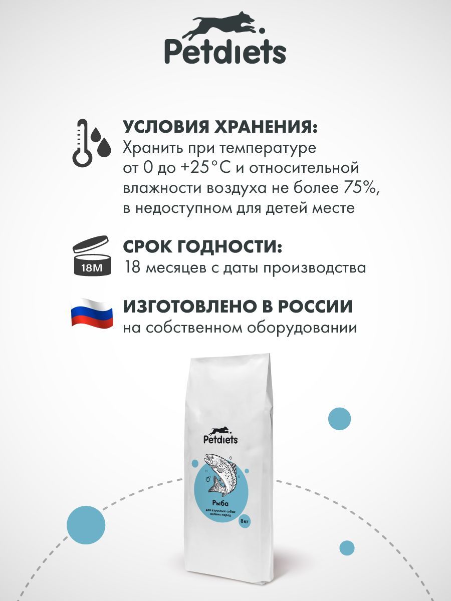 Petdiets Light «Рыба» для взрослых собак мелких пород - это сбалансированное питание, которое поддерживает здоровье кожи, блеск шерсти, обмен веществ и активность вашей собаки каждый день.